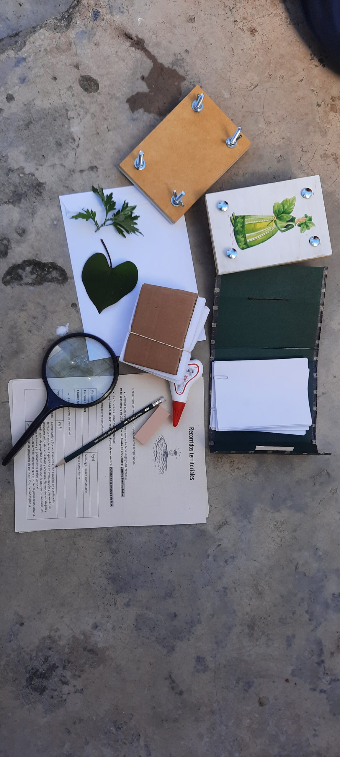 A la entrada del corregimiento nos entregaron nuestro propio kit: prensa, tijeras, sobre de papel, lupa, colbón, lápiz, sacapunta. La tarea: caminar, observar, sentir el suelo y las plantas. Entrar a las huertas. Detenernos en aquel espécimen que nos llamara la atención. Colectarlo, ponerlo en la bolsa blanca. Llegar a casa y observarlo. Acomodarlo entre papeles y cartones. Prensarlo. Esperar.