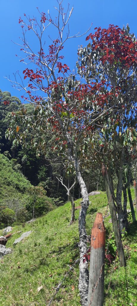 Fauner, también me dijo: “Le dicen el liberal”. Las plantas que no tienen hojas verdes me llaman la atención, son raras. Así como es raro en Colombia encontrarse con alguien “liberal”, de los de verdad. Es decir, el rojo en política viene de la revolución francesa y de los radicales republicanos. Aquí, a la izquierda, le tocó coger el amarillo porque el rojo ya estaba ocupado. Otros de sus nombres comunes me gustan más: sangre de Liébano, lechero rojo, cardenal, sangre de cristo.